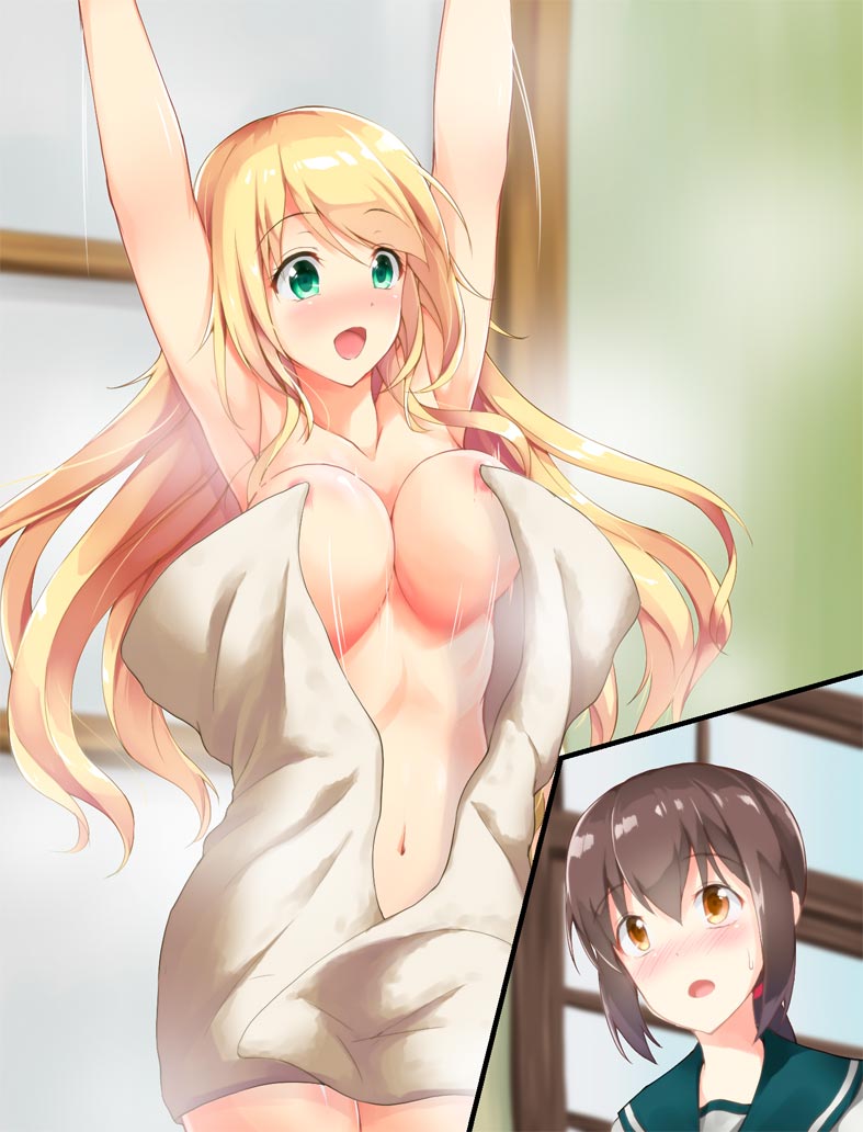 2girlsareola slipareolaearmpitsarms upblonde hairblushbreastsbrown eyesbrown haircollarboneFlag for Deletiongreen eyeslarge breastslong hairmidriffmultiple girlsnaked towelnavelopen mouthopen towelschool uniformserafukusmiletowelvery long hairwardrobe malfunction