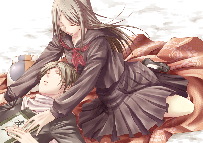 00s1boy1girlbrown haircatfamilyhanairi kikkouhexagonhoneycomb (pattern)japanese clotheskimonoscarfschool uniformserafukusleepingsnow