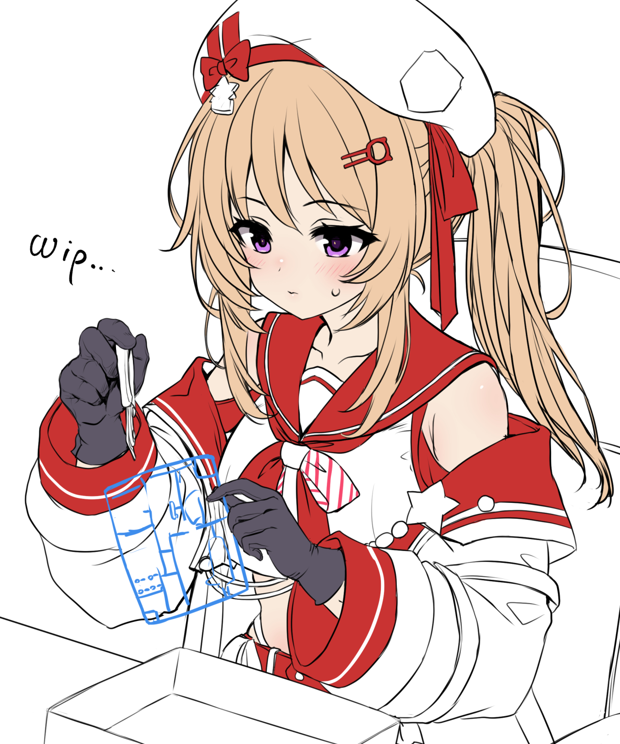 1girlarmpit creasebare shouldersberetblack glovesblonde hairblushbowchoppy bangsclosed mouthgloveshair ornamenthaircliphathat bowholdingjacketjacket partially removedlong hairlong sleeveslooking at objectponytailpurple eyesred bowred sailor collarsailor collarshirtsimple backgroundsittingsolosweatdropwhite backgroundwhite hatwhite jacketwhite shirtworking