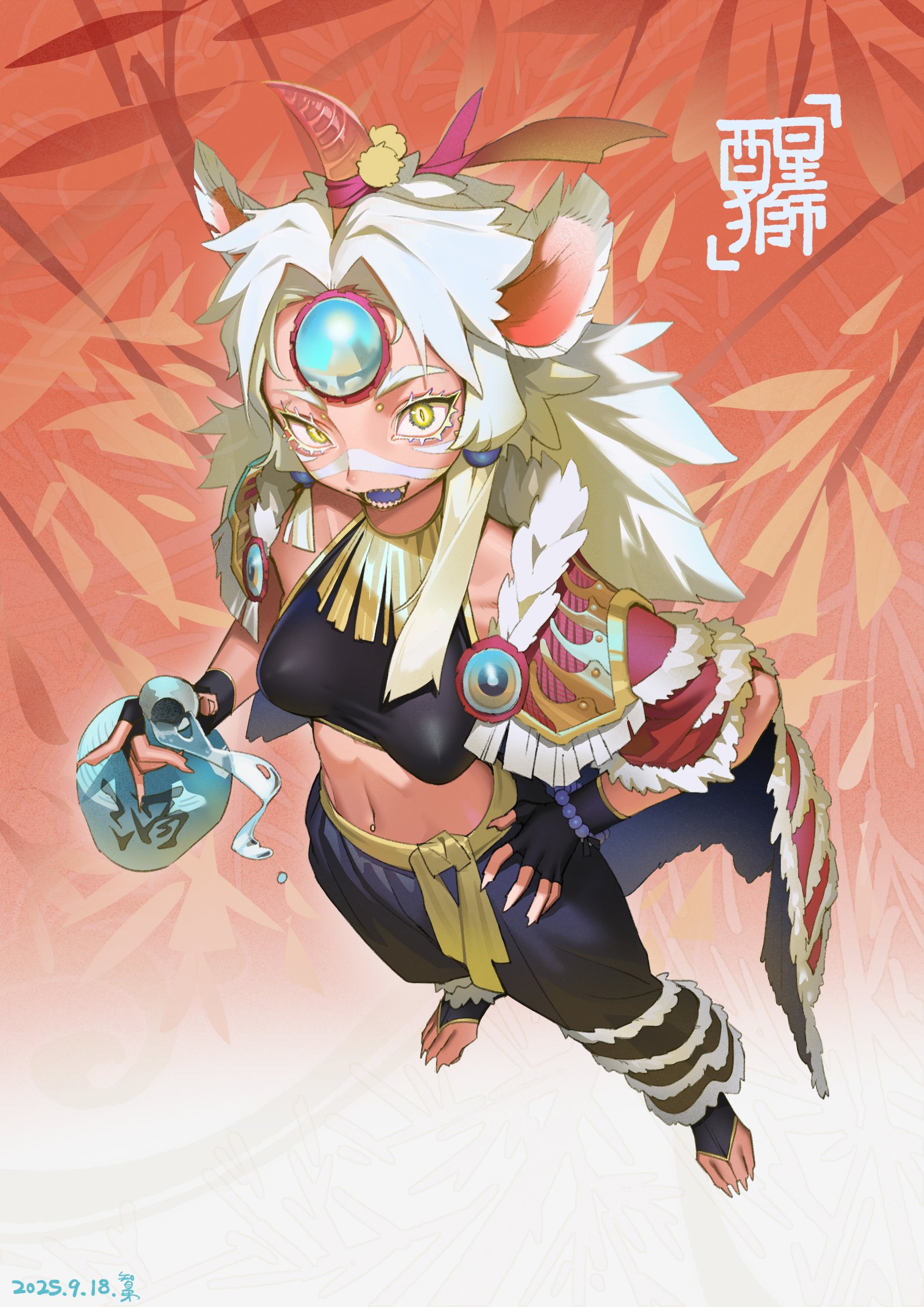 fi zz ill, original, commission, highres, tagme, 1girl, armlet, azalea(fi zz ill), bracelet, condom, earrings, english text, flower, flower hairpin, hair bun, hair flower, hair ornament, heart, holding, holding condom, jewelry, looking at viewer, sharp teeth, solo, teeth