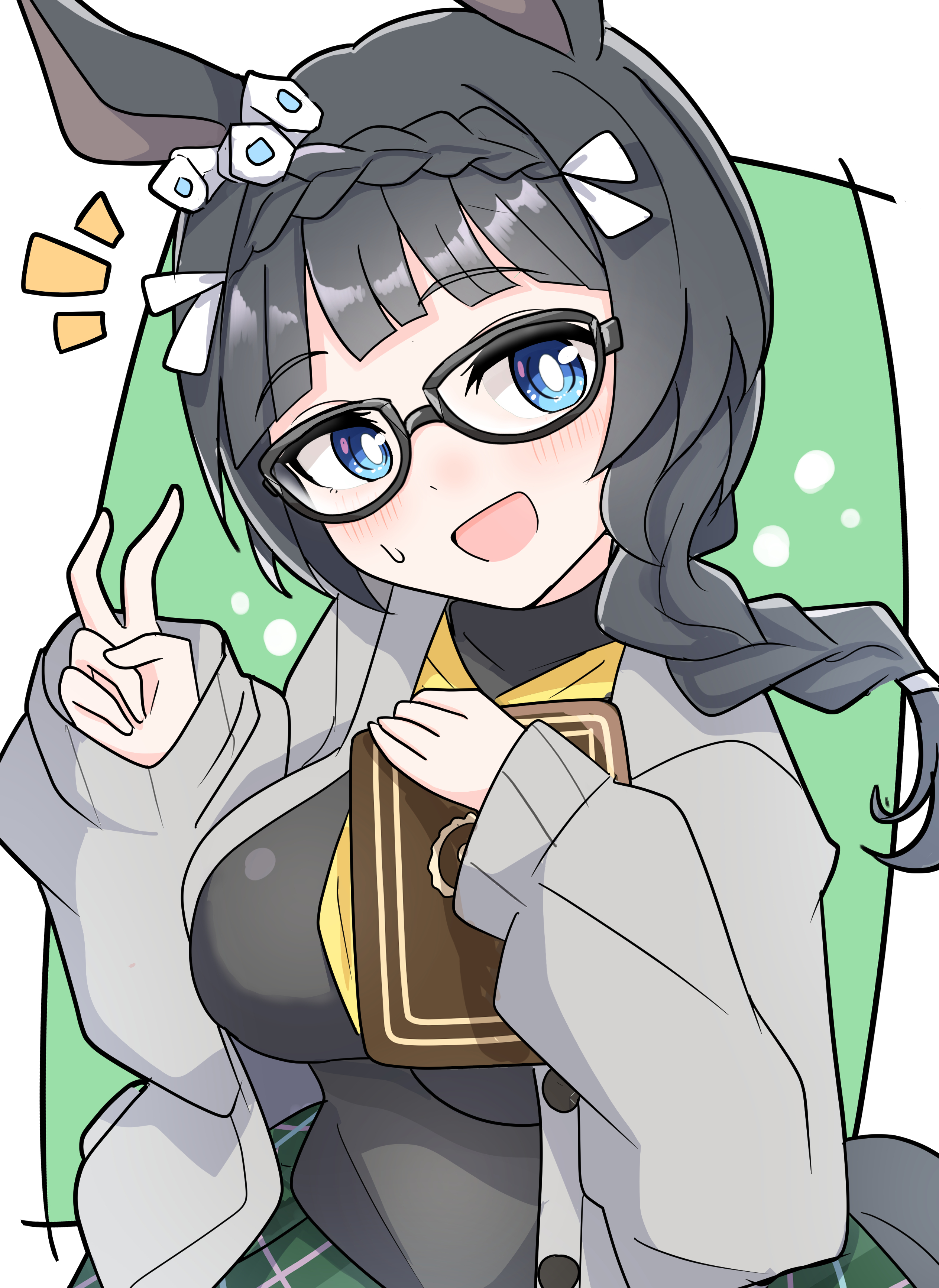 1girlanimal earsblack-framed eyewearblushbowbraidbraided ponytailcrown braidear ornamentear scrunchieglasseshorse earshorse girlhorse tailhorseshoe ornamentlong hairlooking at vieweropen mouthsailor collarsailor shirtschool uniformshirtsmilesolotail