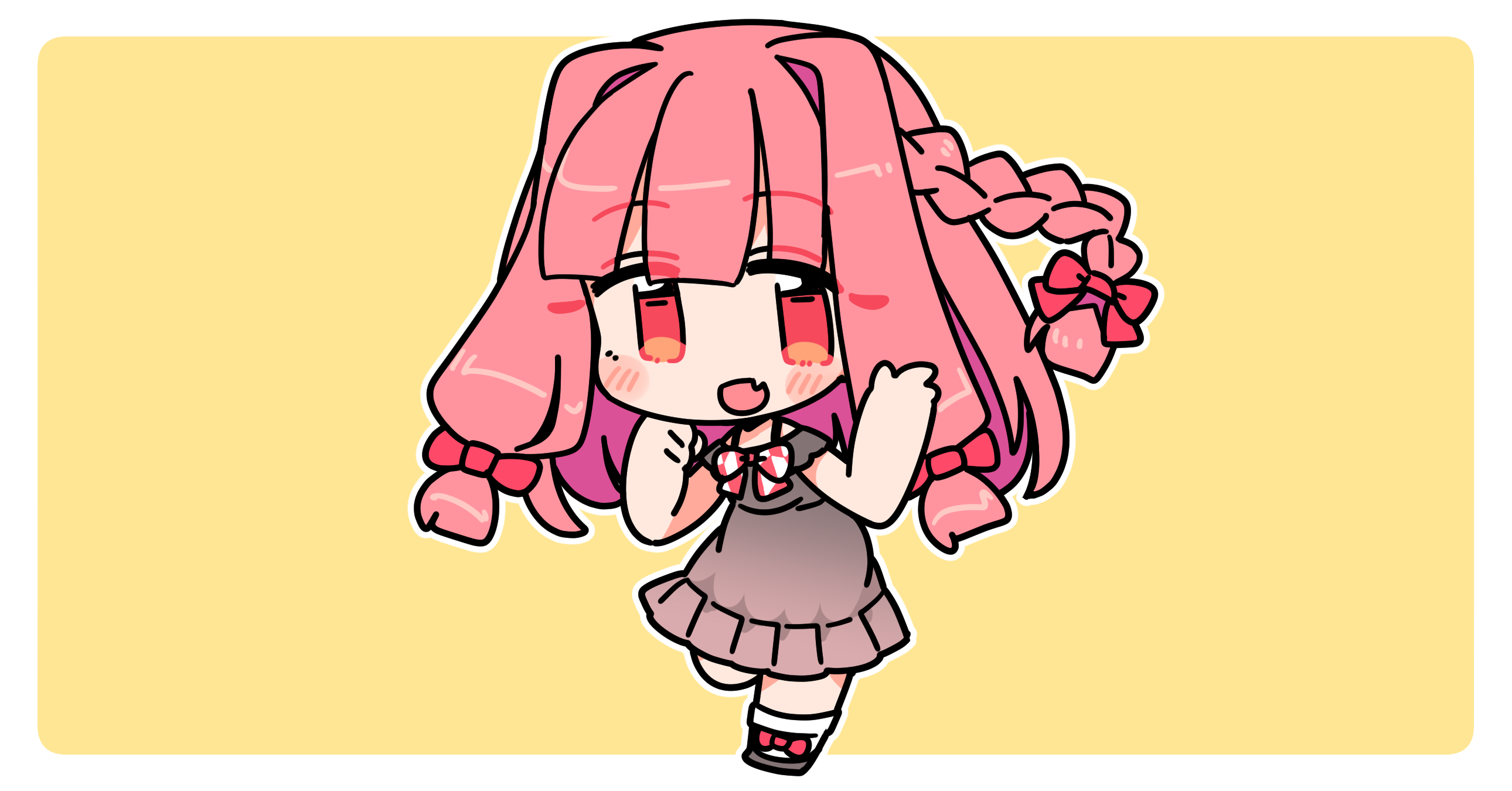 :d1girlblack shoesblush stickersborderbowbowtiebraidbrown dressdressfangfull bodyhair bowhands uplong hairlooking at vieweropen mouthoutlineoutside borderpink hairred bowred bowtiered eyesshoesshort sleevessimple backgroundsingle braidskin fangsmilesockssolostandingstanding on one legwhite borderwhite outlinewhite socksyellow background