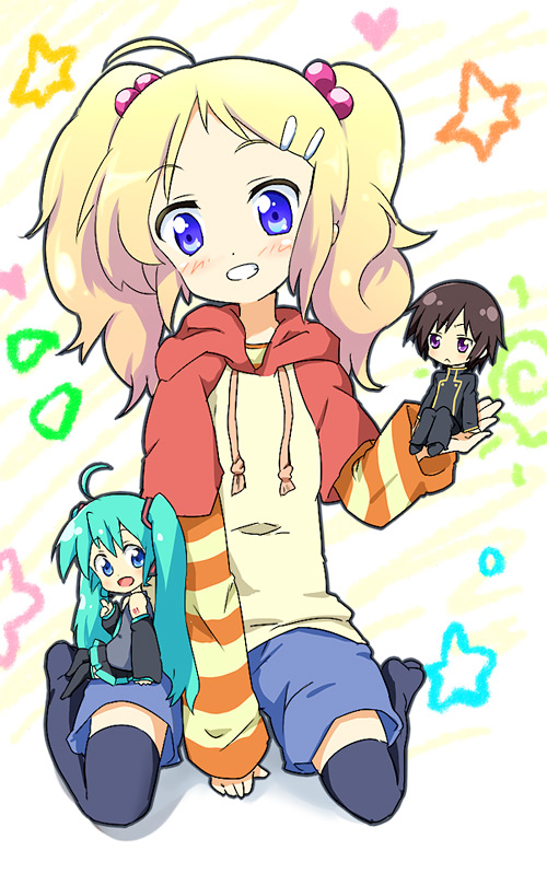 00sblonde hairblue eyesblushbrown hairchildcrossoverhair ornamenthairclipkneelingpurple eyesthighhighstwintails