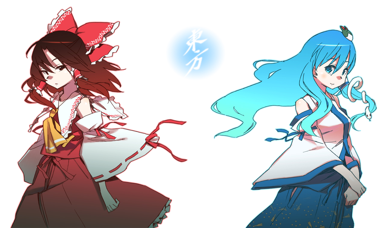 2girlsblue eyesblue hairblushbrown eyesbrown hairdetached sleevesfemale focusgradient hairhair ribbonjapanese clotheslong hairlooking at viewermikomulticolored hairmultiple girlsown hands togetherribbonsmile