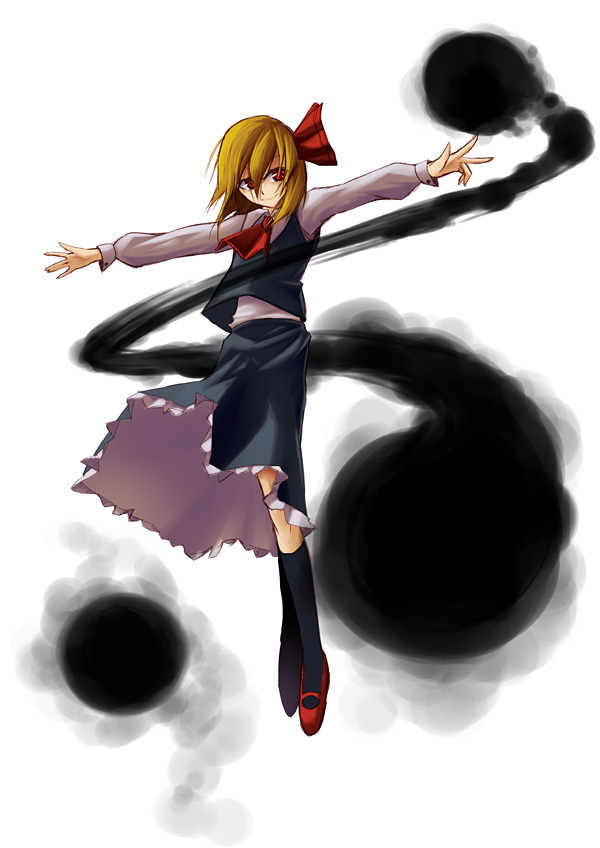 1girlblonde hairdarknessfemale focushair ribbonoutstretched armsred eyesribbonshort hairsolospread arms