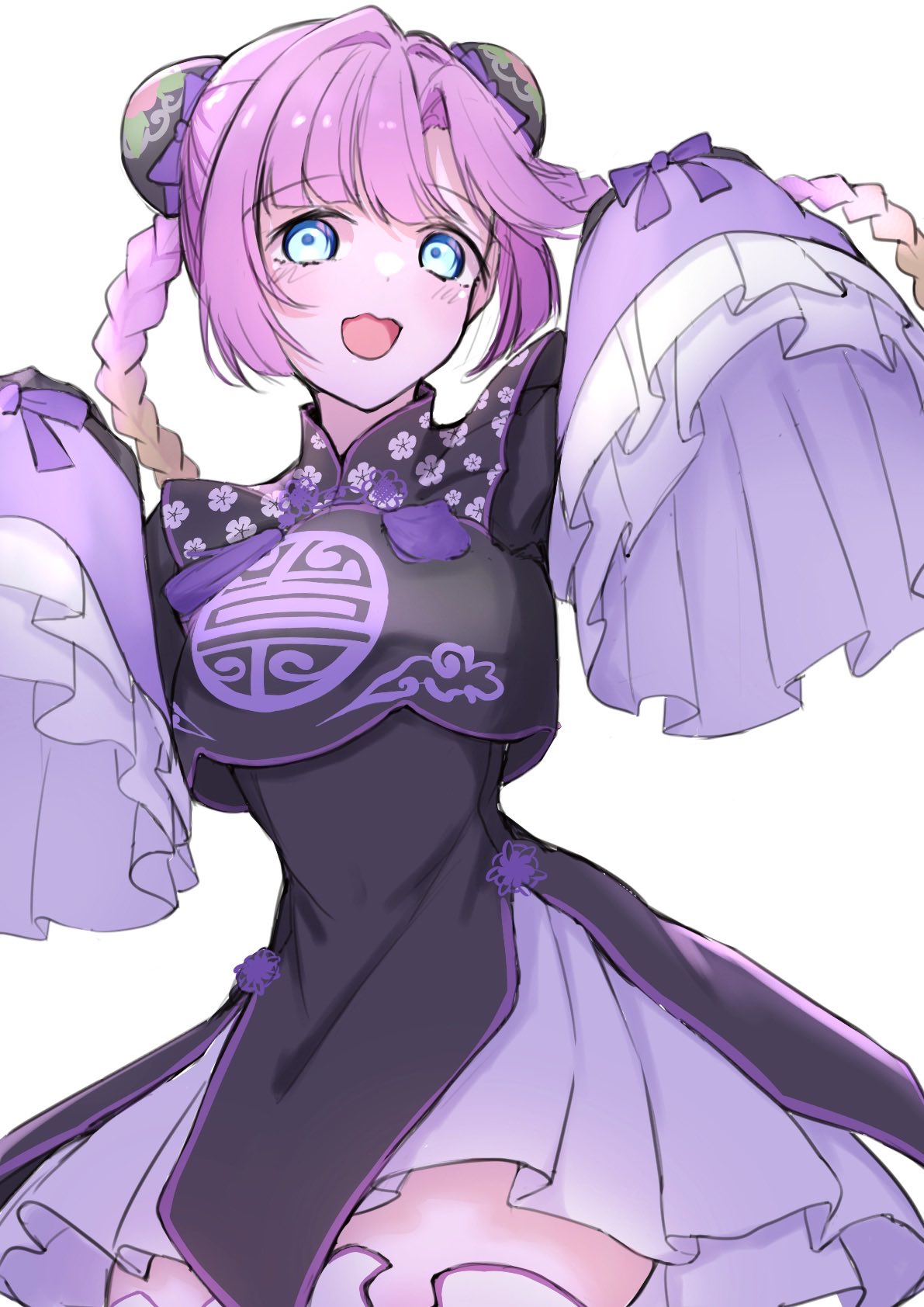 :d1girlblack dressblack shirtblonde hairblue eyesbraidbun coverchina dresschinese clothescowboy shotdouble bundressfrilled dressfrillsgradient hairhair bunhasu no sora pop up shop china collectionlong sleeveslooking at viewermulticolored hairofficial alternate costumeopen mouthovershirtpink hairshirtsimple backgroundsleeves past fingerssleeves past wristssmilesolotasselthighhighstwin braidsvirtual youtuberwhite backgroundwhite thighhighs