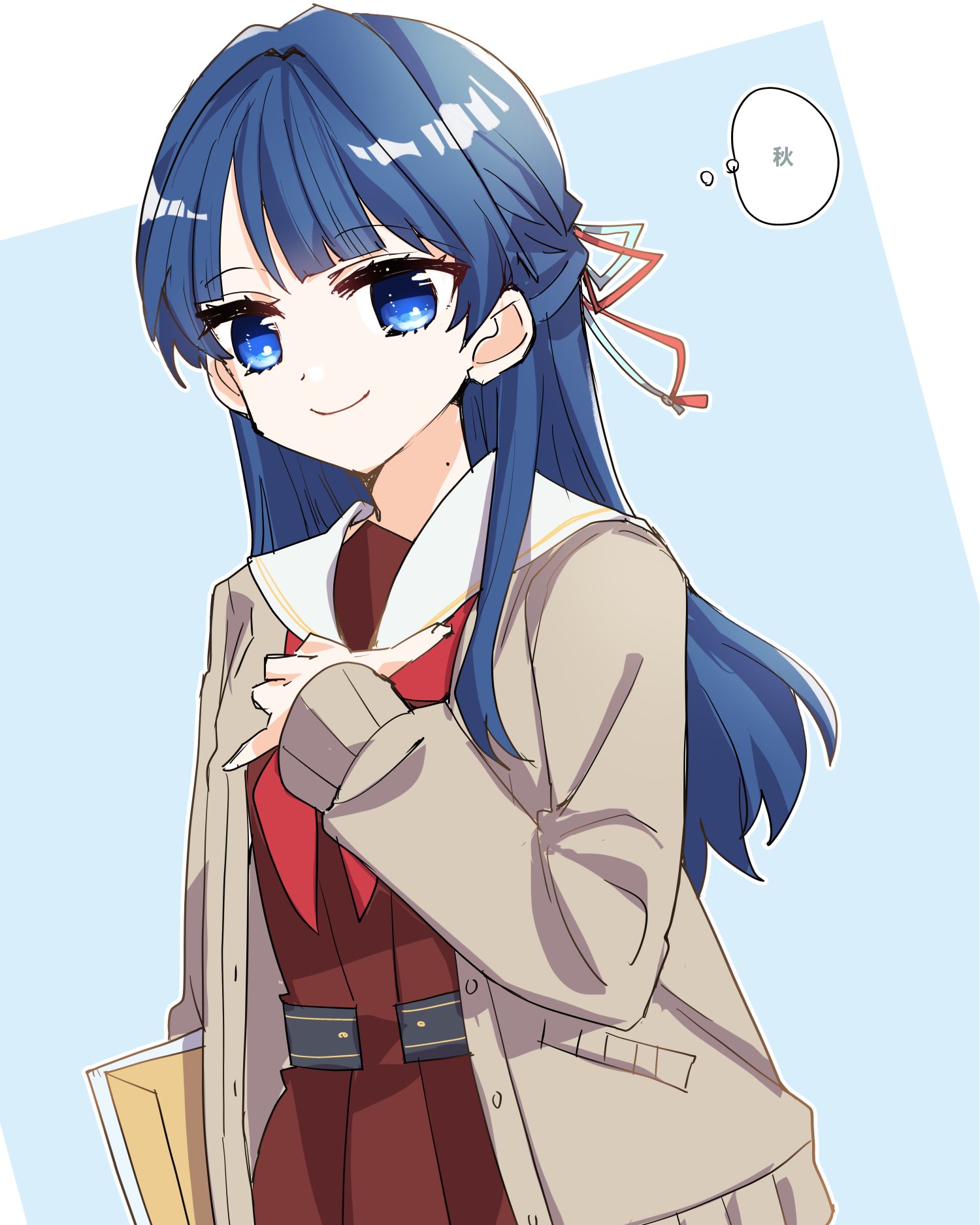 1girlblue ribbonbreastsbrown cardiganbrown dresscardiganclosed mouthcowboy shotdresshair ribbonhalf updohasu no sora school uniformlong sleeveslooking at viewermolemole on neckneckerchiefopen cardiganopen clothesred neckerchiefred ribbonribbonsailor collarsailor dressschool uniformsmilesolospeech bubblethought bubblevirtual youtuberwhite sailor collarwinter uniform