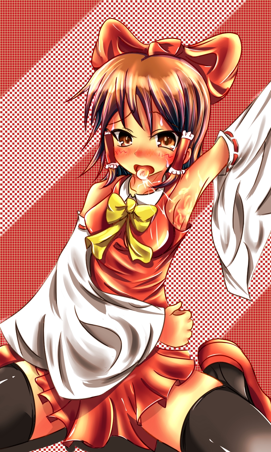 1girlarmpitsblushbrown hairdetached sleevesfemale focuslickinglicking armpitribbonsolothighhighstongue