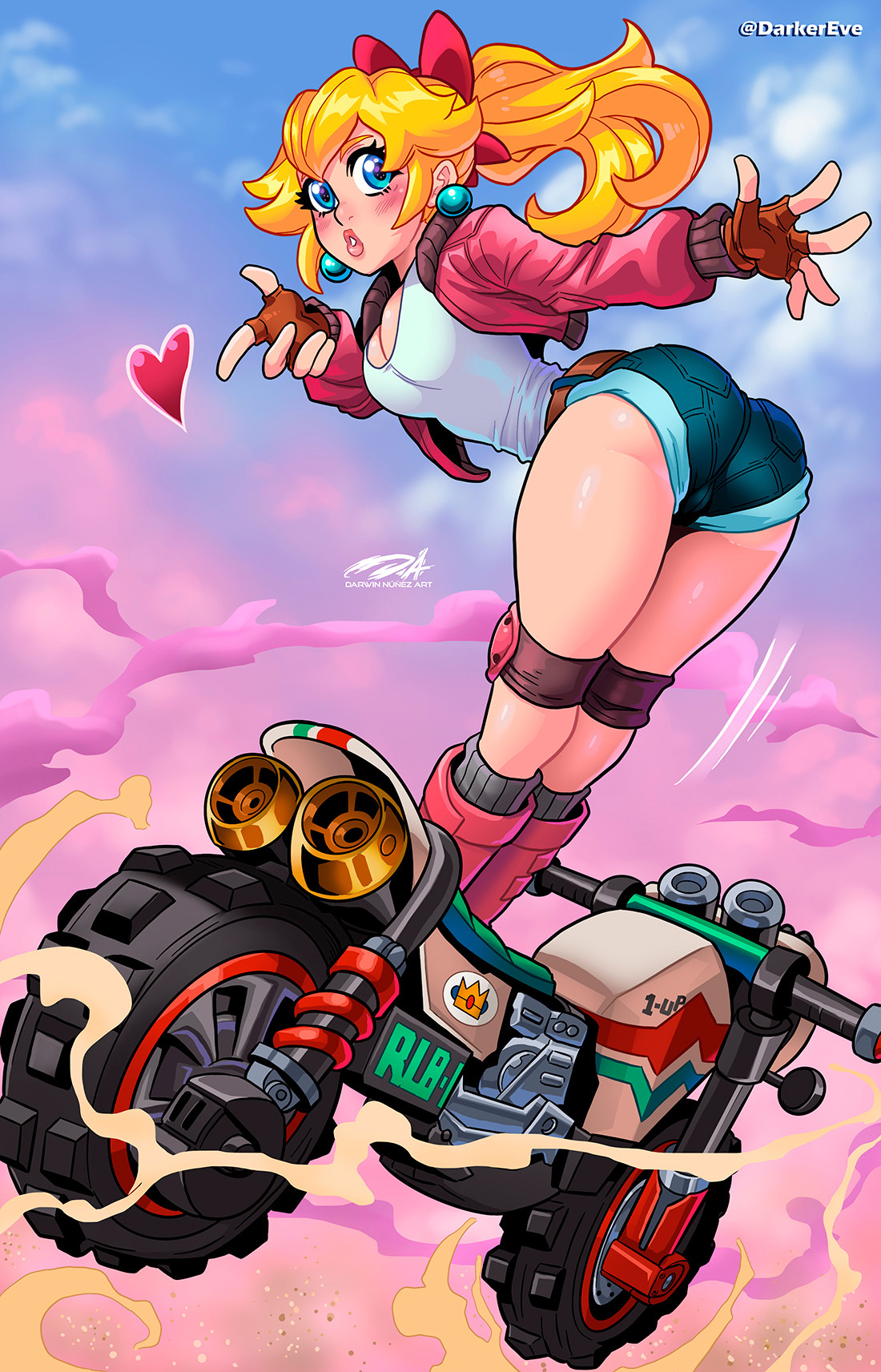 glazearty, inaba meguru, sanoba witch, commentary, highres, 1girl, :d, arm at side, bloom, blue bow, blue bowtie, blue scrunchie, blush, bow, bowtie, cowboy shot, crossed bangs, eyelashes, eyes visible through hair, fang, floating hair, grey sailor collar, grey skirt, hair between eyes, hair ornament, hair scrunchie, happy, heart, jacket, letterman jacket, long hair, looking at viewer, miniskirt, one side up, open mouth, orange hair, pink jacket, plaid clothes, plaid skirt, pleated skirt, red eyes, sailor collar, school uniform, scrunchie, serafuku, sidelocks, simple background, skin fang, skirt, sleeves past fingers, sleeves past wrists, smile, solo, very long hair, wavy hair, white background, white sleeves