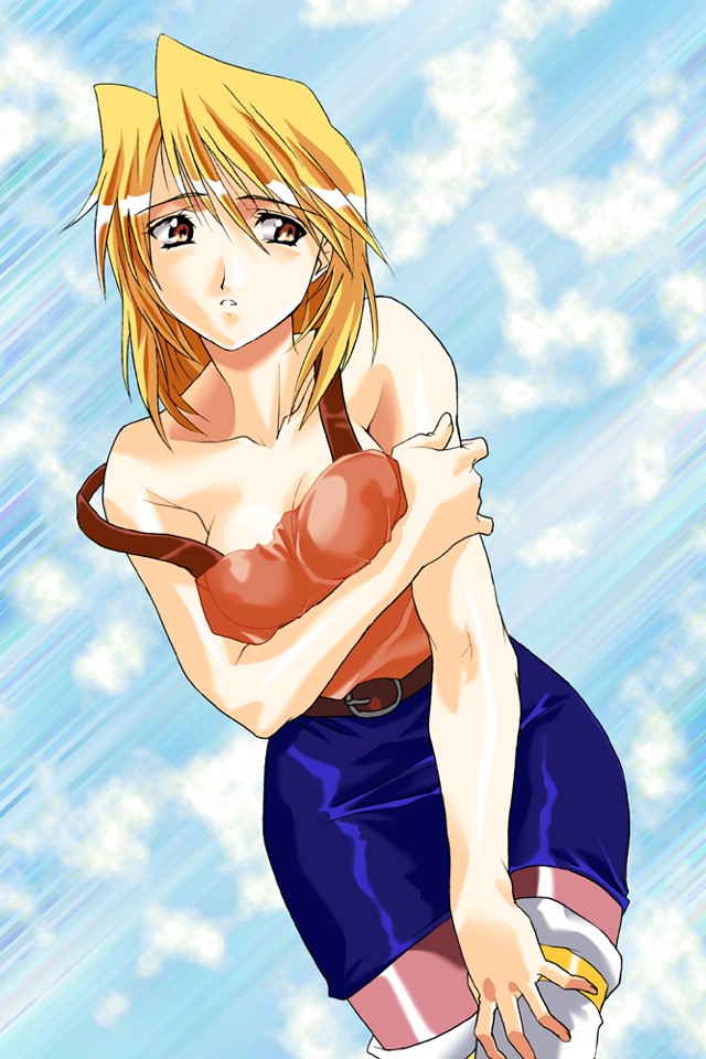 yetigame, wakatsuki shuri, myself yourself, yeti (copyright), silver hair, 00s, 1girl, breasts, brown eyes, female focus, full body, hands on own hips, long sleeves, looking at viewer, miniskirt, pleated skirt, school uniform, serafuku, simple background, skirt, small breasts, solo, standing, text focus, thighhighs, white background, zettai ryouiki