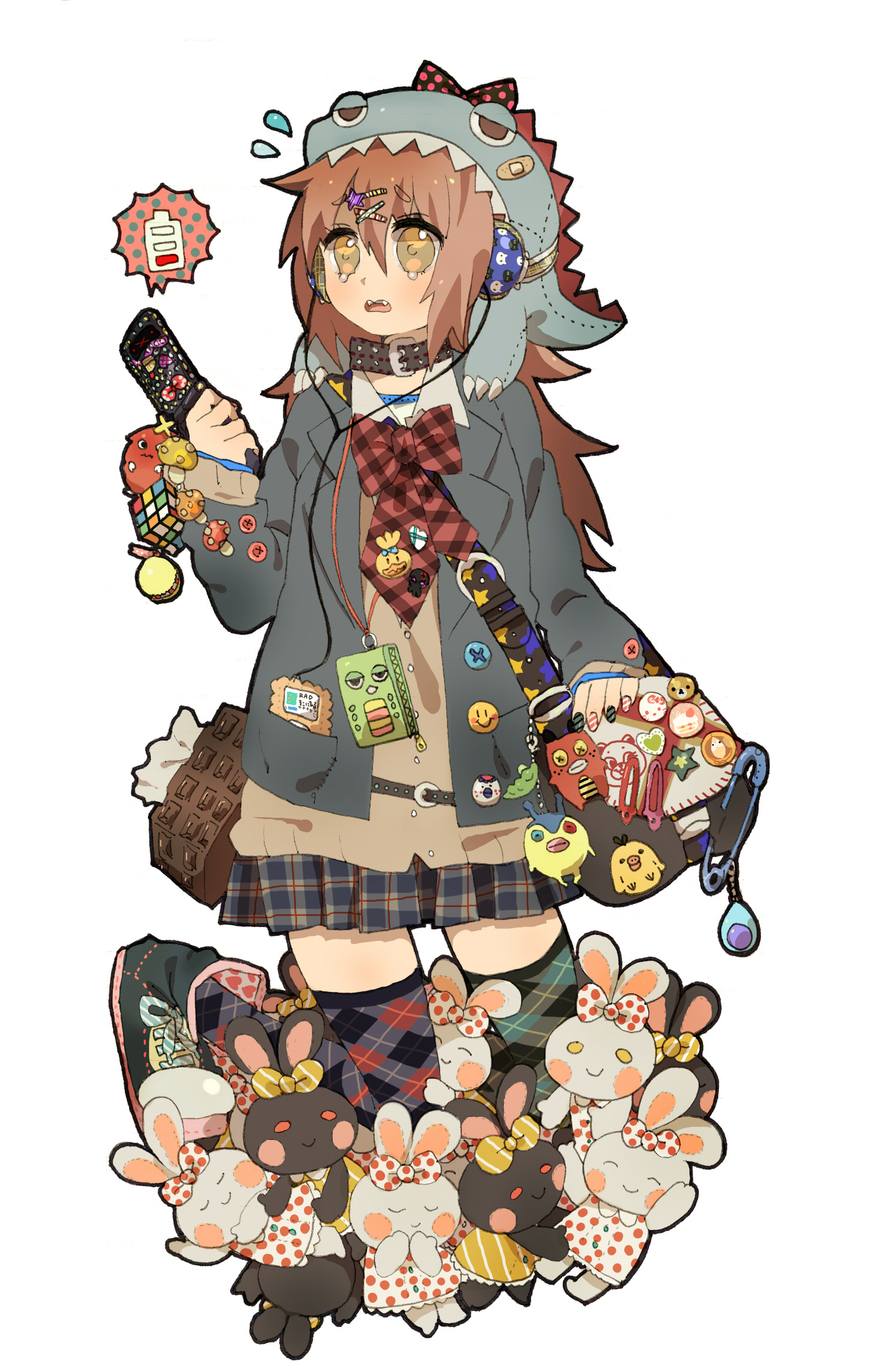 1girlabsurdly detailed compositionanimal hatargyle clothesargyle thighhighsasymmetrical legwearbadgebagbandaidbowbrown hairbutton badgebuttonscellphonecellphone charmcellphone radio barcellphone strapcharm (object)chokercollarcubedigital media playerfangsfashionfemale focushair between eyeshair ornamenthaircliphandbaghatheadphonesipodipod nanoipod nano 3gjacketlayered clotheslong hairminiskirtmismatched legwearmulticolored nailsnail artnail polishnecktieopen mouthpatterned legwearphoneplaid clothesplaid necktieplaid skirtpleated skirtpolka dotrabbitribbonrubik's cubesafety pinskirtsolostreetwearstuffed animalstuffed rabbitstuffed toysweatdropsweatertearsteeththighhighstissueupper teeth onlywhite backgroundyellow eyeszettai ryouiki