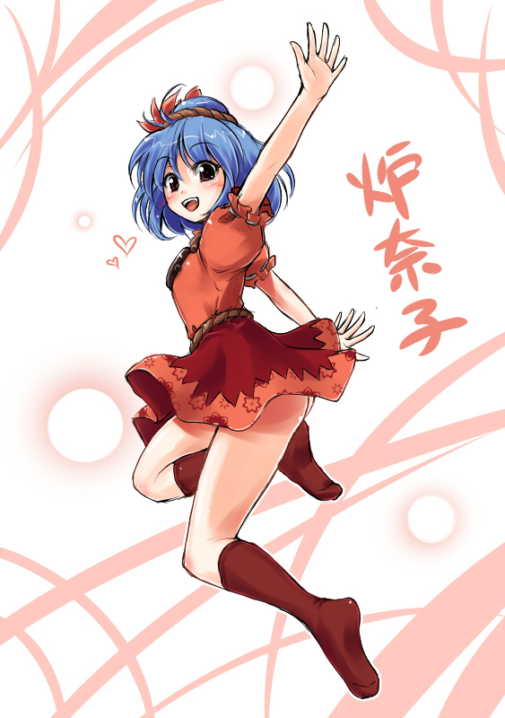 1girlaged downblue hairfemale focushair ornamentkneehighsleaf hair ornamentminiskirtopen mouthoutstretched armsoutstretched handred eyesshort hairskirtsmilesockssolospread arms