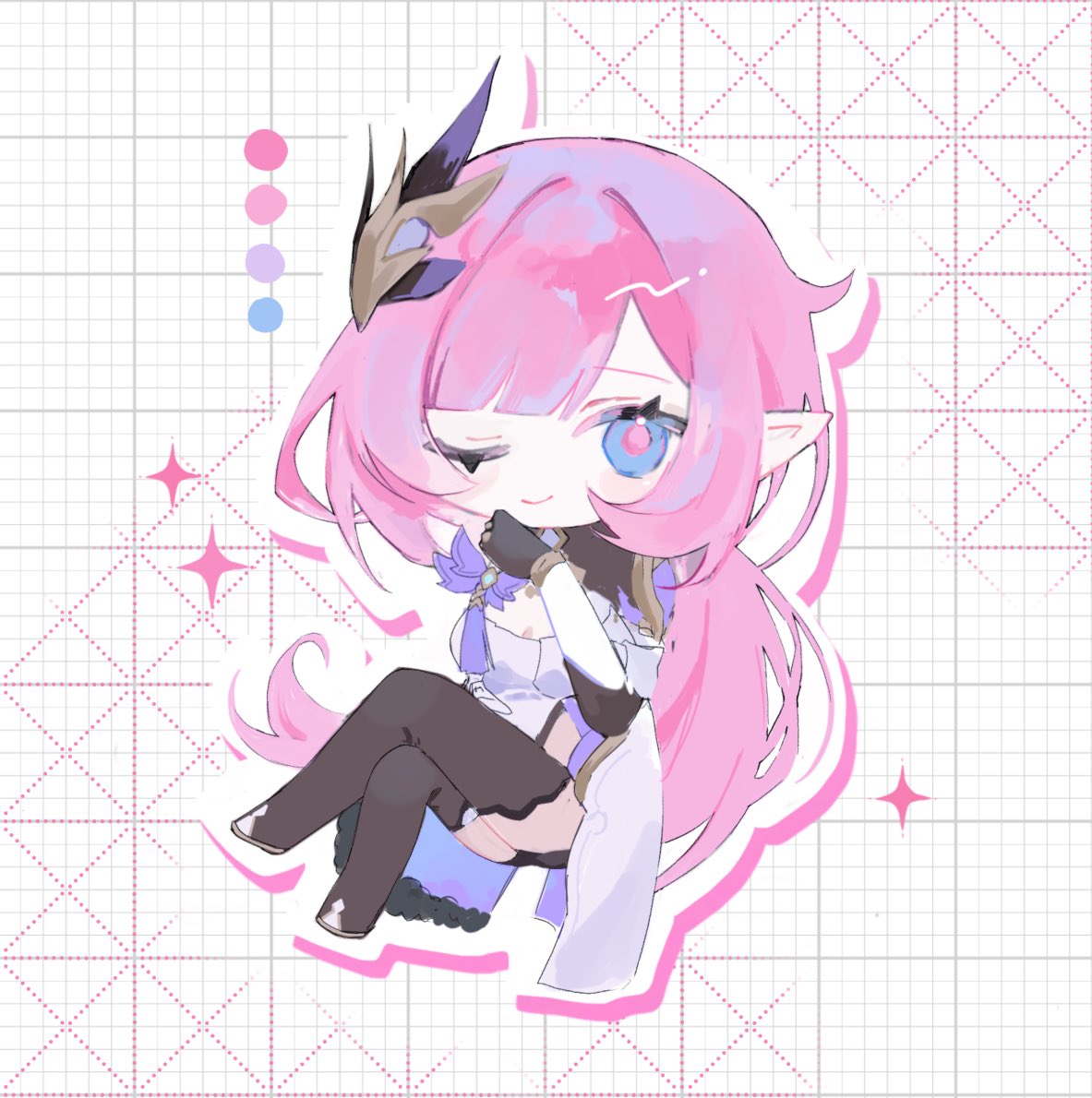 1boy1girlblack bootsblack glovesblue eyesbootsbreastscleavagecorsetcrossed legselfglovesgrid backgroundhair ornamentlarge breastslong hairlooking at viewerone eye closedpink hairpointy earssmilesolovery long hairwhite corset