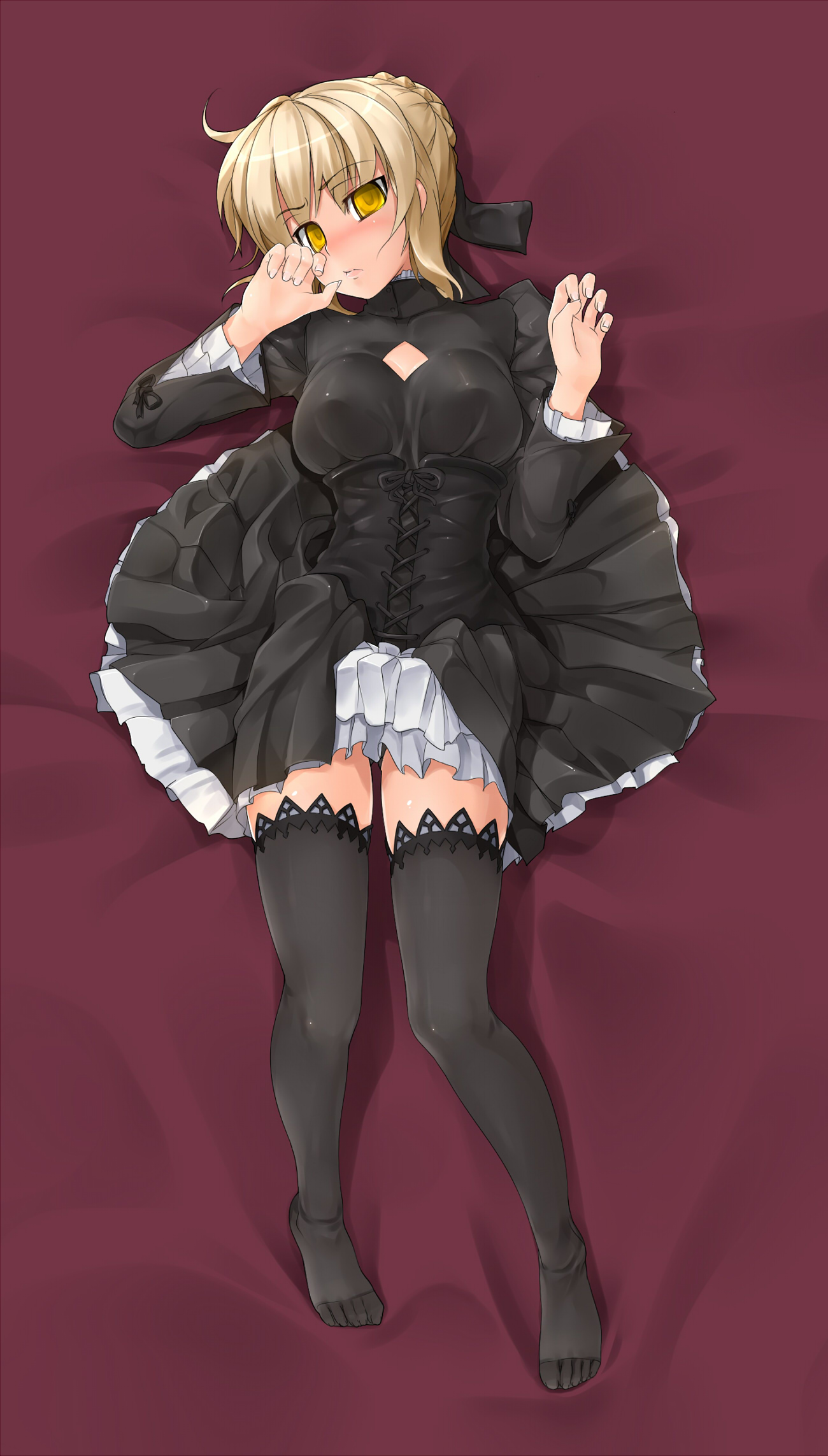00s1boy1girlblack thighhighsblonde hairblushbreastscorsetdressfeetfemale focusfingernailsgothic lolitahair ribbonlarge breastslolita fashionlooking at viewerlyingno shoesofficial alternate costumeon backribbonshort hairsolothighhighstoesyellow eyeszettai ryouiki