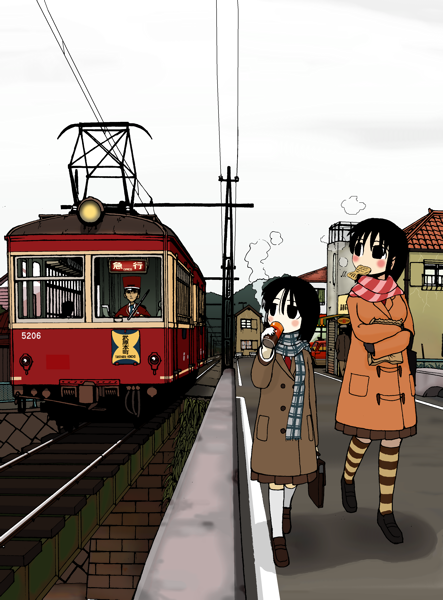 1boy2girlsblack hairblushdayeatingfoodfull bodylong hairmouth holdmultiple girlsmultiple unit trainoutdoorsovercastoverhead linepantographpantyhoserunning bondscarfshort hairskysocksstreetcarstriped clothesstriped pantyhosetaiyakithighhighstrainwagashi