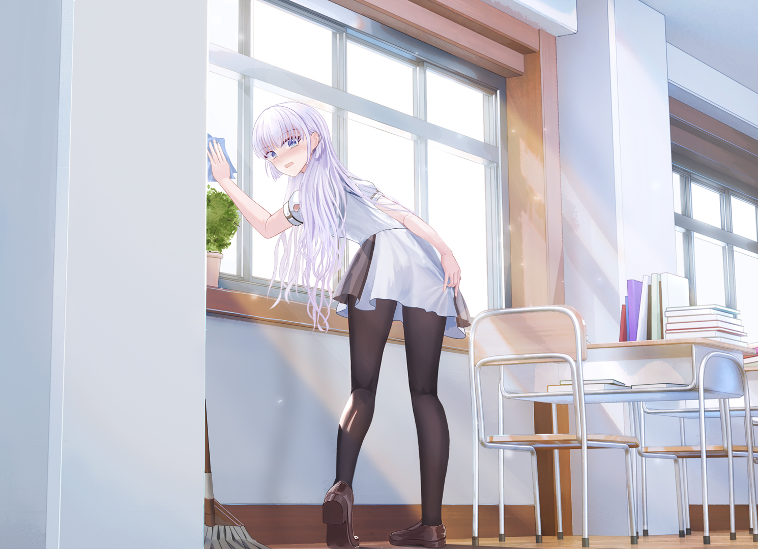1girlarm behind backblack pantyhoseblue eyesblushbrown shoesclassroomcovering asscovering privatesdayembarrassedfrom behindfull bodyhair behind earhair between eyeshair ornamenthaircliphand upindoorskneepitsleaning forwardlight raysloaferslong hairlooking at viewerlooking backminiskirtopen mouthpantyhoseparallel hairclipsplantpleated skirtpotted plantschool uniformshirtshoesshort sleevesskirtsolostandingsummer pockets school uniformsunbeamsunlighttiptoesuser 3504221very long hairwhite hairwhite shirtwhite skirtwindowwiping