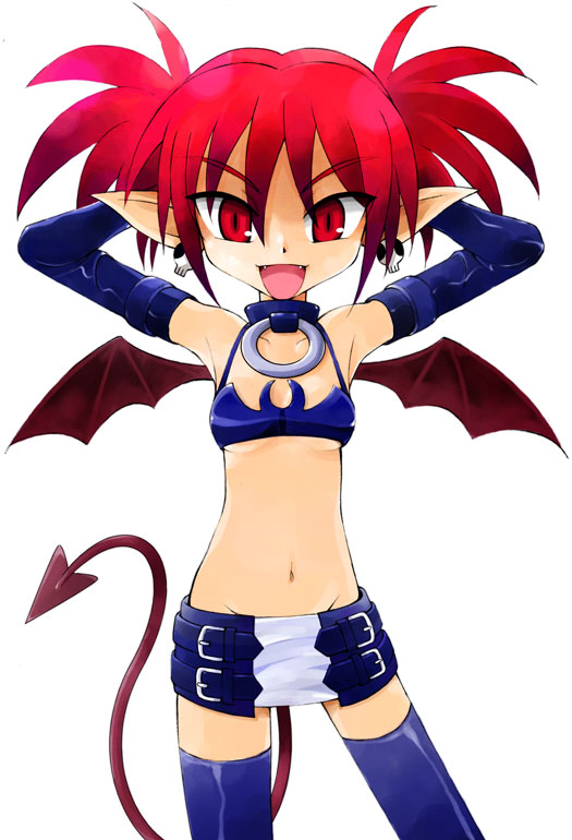 1girlbat wingsdemon girlearringselbow glovesfangsfemale focusgloveshands on own headjewelrymidriffnavelpointy earsred eyesred hairsolotailthighhighswings