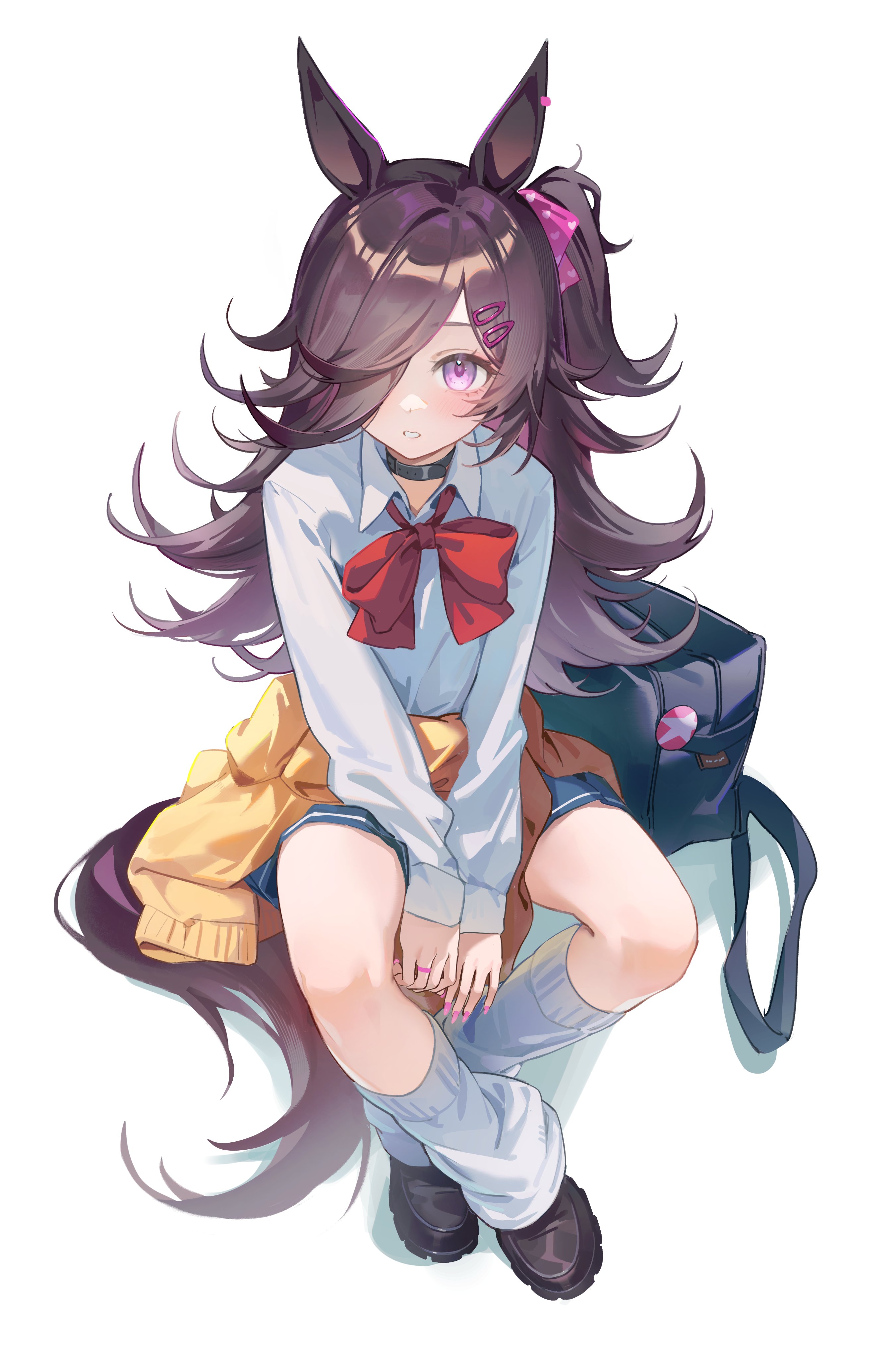 1girlanimal ear piercinganimal earsarms between legsasymmetrical bangsbadgebagblack chokerblack shoesblue skirtblushbowbowtiebrown hairbutton badgecardigancardigan around waistchokerclothes around waistcollared shirtcrossed anklesfingernailsflipped hairfull bodygyaruhair bowhair ornamenthair over one eyehairclipheartheart printhorse earshorse girlhorse tailjewelryleg warmersloaferslong hairlong sleeveslooking at viewerloose bowtienail polishone eye coveredone side upopen collaropen mouthparallel hairclipsparted bangspink bowpink nailspleated skirtpurple eyesred bowred bowtieringschool bagshirtshoessimple backgroundsittingskirtsolotailv armswhite backgroundwhite leg warmerswhite shirtyellow cardigan
