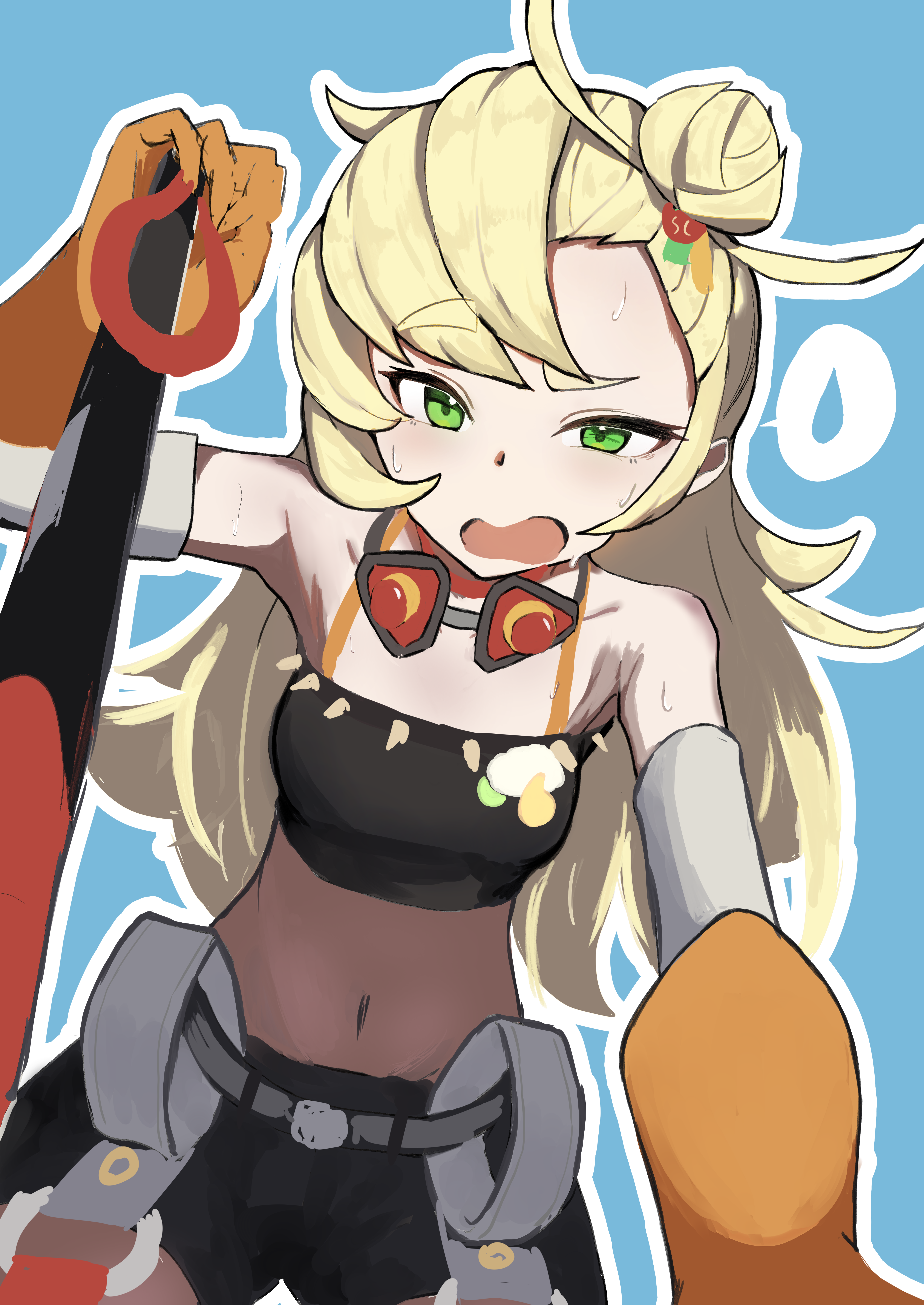 1girlblack shortsblonde hairblushbreastscrop topglovesgogglesgoggles around neckgreen eyeshair bunlong hairlooking at viewermidriffnavelopen mouthorange glovesshortssmall breastssolospiked shirttemporal hairline