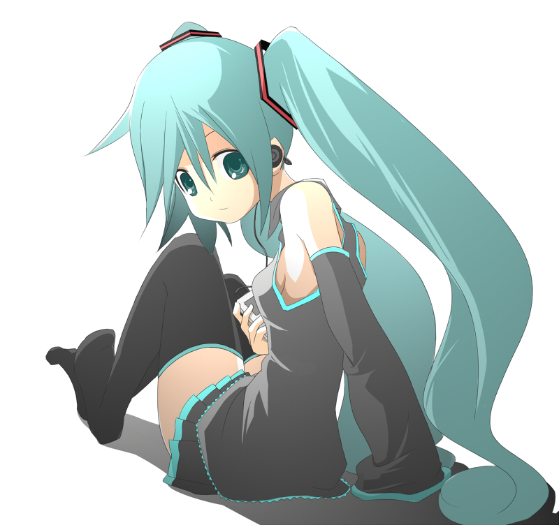 1girlaqua hairarmpitsbreastsdigital media playerearbudsearphonesfemale focusheadphonesipodlong hairsideboobsittingsmall breastssolothighhighstwintailsvery long hairzettai ryouiki