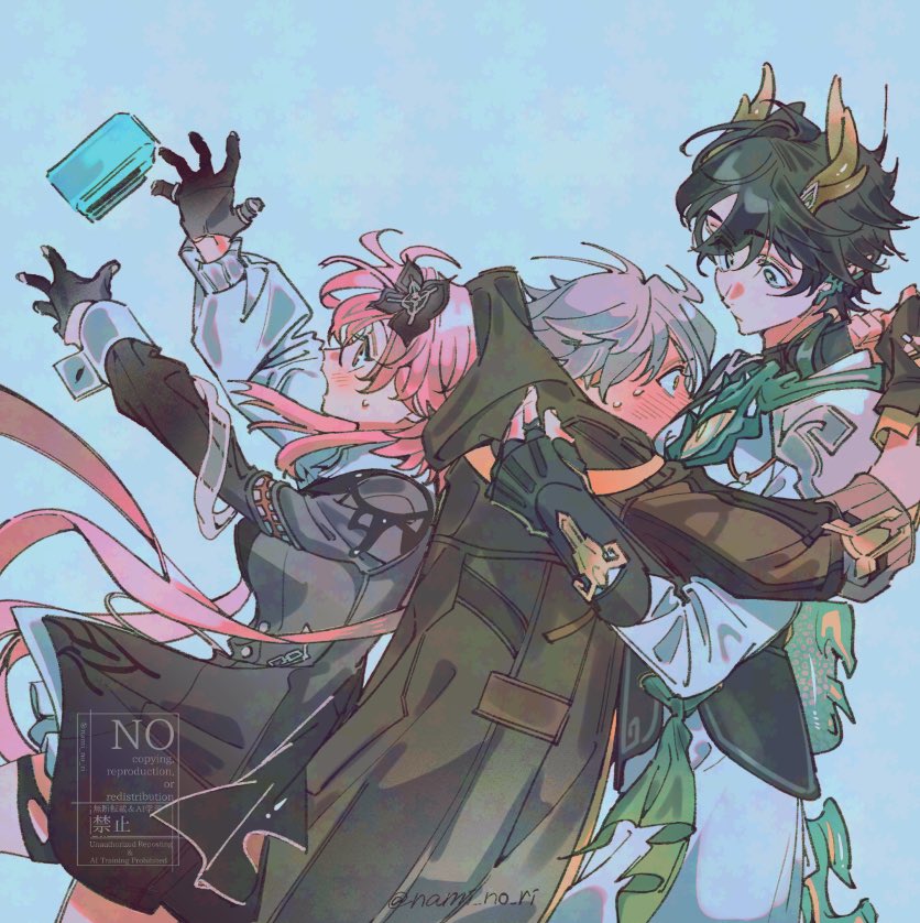 1girl2boysarms upartist nameblack coatblack dressblack flowerblack glovesblack hairblack shirtblue backgroundblushbreastscamerachinese clothesclosed mouthcoatcovered mouthcowboy shotdragon boydragon hornsdragon taildressearclipeyelinerfingerless glovesfloating hairflowerglovesgrey eyesgrey hairhair between eyeshair flowerhair ornamenthoodhooded coathornsjewelrylong hairlong sleeveslooking at anotherlooking at objectlow ponytaillow twintailsmakeupmedium breastsmultiple boysmultiple ringsofficial alternate costumeofficial alternate hairstyleopen mouthpink hairpointy earsponytailpuffy long sleevespuffy sleevesred eyelinerred eyesringshirtshort hairsimple backgroundstandingsurprisedsweatsweatdroptailtwintailstwo-tone dresswatermarkwavy hairwhite coatwhite dresswide-eyedyaoiyellow eyes