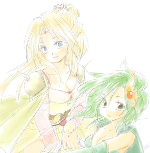 1990s (style)2girlsaged upblonde hairblue eyescapegreen hairhair ornamentmultiple girlsponytailretro artstyle