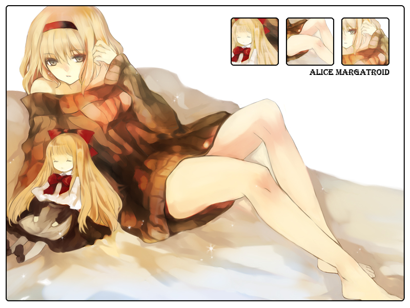 1girlbare shouldersbarefootblonde hairblue eyesdressfemale focushairbandlegsshort hairsolosweatersweater dressthighs