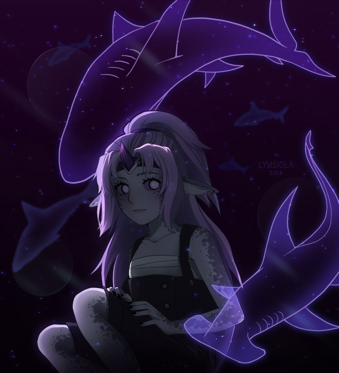 artist namebare shouldersblack dressblack nailsblurryblurry backgroundborrowed characterboseclosed mouthcolored scleracolored skindateddresseyelashesfeet out of frameflat chestgrey scleragrey skinhornslight particleslong hairlooking at viewerno pupilspointy earspurple backgroundpurple eyespurple hairpurple hornssharkshark girlsidelockssingle hornsquatting