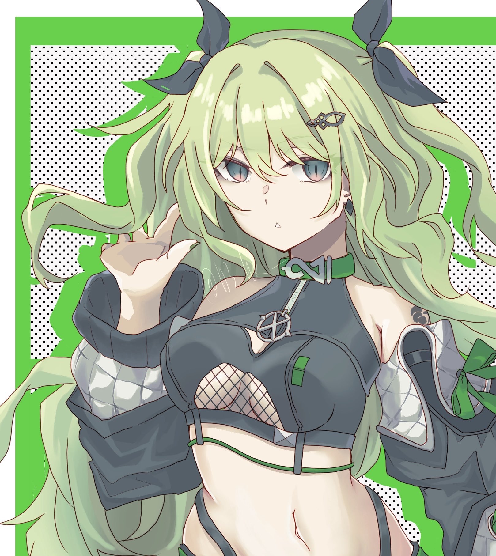 1girlbare shouldersblack ribbonbreastsclothing cutoutcrop topdetached sleevesfishnet cutoutgreen hairgreen nailshair ribbonlooking at viewermedium breastsnavelofficial alternate costumeofficial alternate hairstyleribbonslit pupilssolostomachtwintailsunderboob cutout