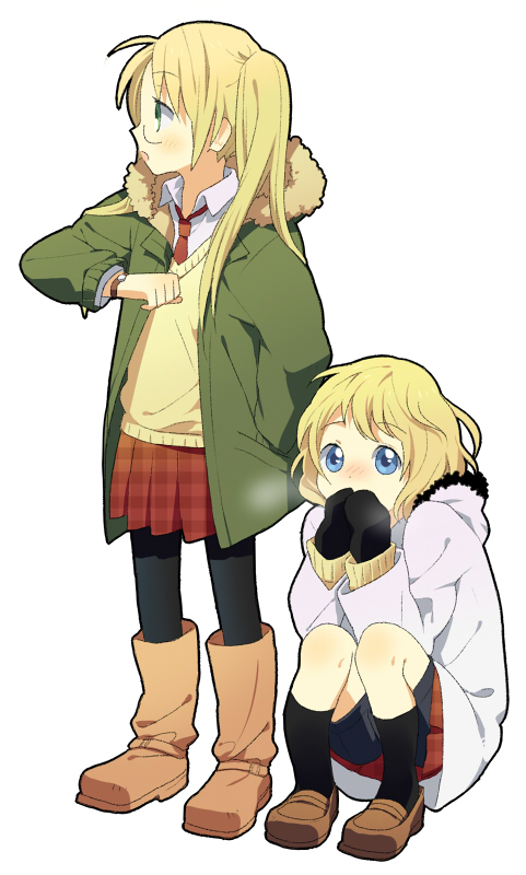 bike shortsblonde hairblue eyesblushbootsbreathcoldgreen eyeslong hairmittensnecktiepantyhoseshoesshort hairskirtsockssquattingsweater