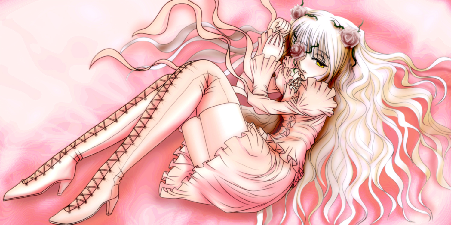 00sbootsdresseyepatchflowerfrillslong hairlyingrosesolothigh bootsthighhighswhite hairyellow eyes