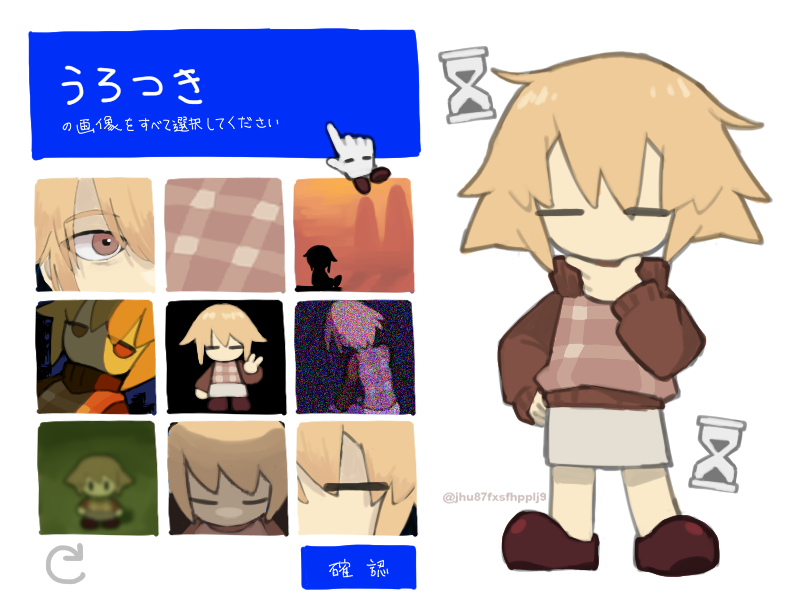 1girlblonde hairbrown shoesbrown sweatercaptchachibiclosed eyesfacing viewergrey sweater vesthair flapshand cursorhourglasslong sleevesmultiple viewsplaid clothesplaid sweater vestplaid vestshoesshort hairsidelocksskirtsweatersweater vestthinkingtwitter usernamevestwhite skirt
