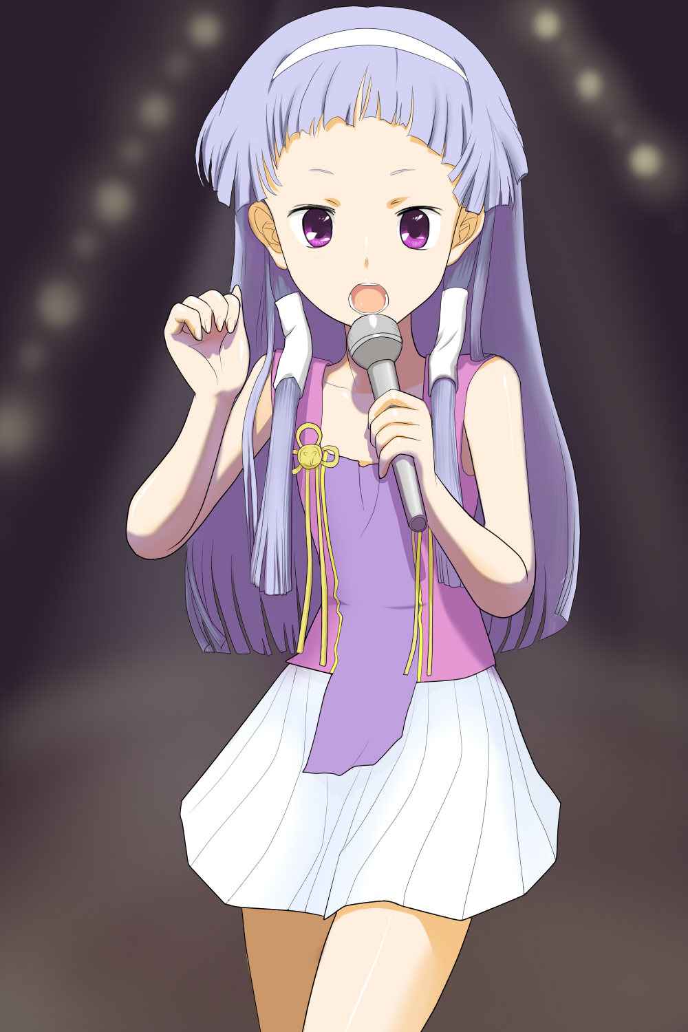 00s1girlblue hairblunt bangsfemale focushair tubeshairbandlong hairmicrophonemusicpleated skirtpurple eyessingingskirtsolowhite skirt
