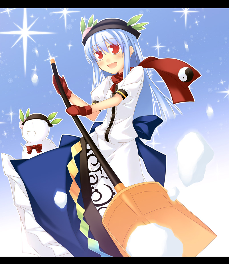 1girlblue hairfemale focushatletterboxedmittensoutdoorsred eyesscarfshovelskysnowsnow shovelsnowmansolostandingworktool