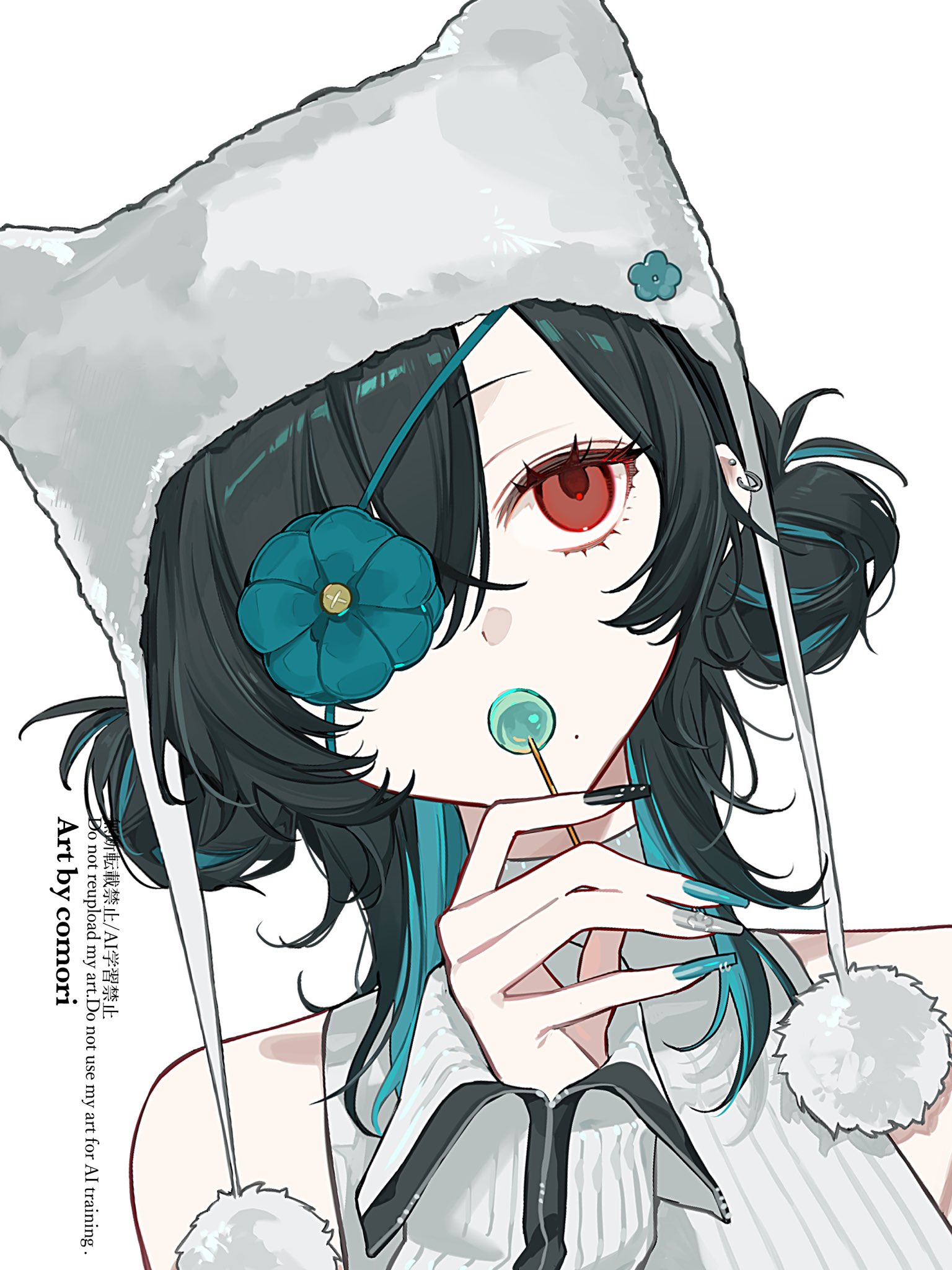 1girlartist namebare shouldersblack hairblack nailsblue hairblue nailscandyear piercingeyelashesfingernailsfoodgrey nailshair over one eyehatholdingholding candyholding foodholding lollipoplollipoplong fingernailslong hairlong sleeveslooking at viewermolemole under eyemulticolored hairmulticolored nailsnail polishpiercingpom pom (clothes)portraitribbed sweatersimple backgroundsleevelesssleeveless sweatersolosweaterturtleneckturtleneck sweatertwo-tone hairwatermarkwhite backgroundwhite hatwhite sweater