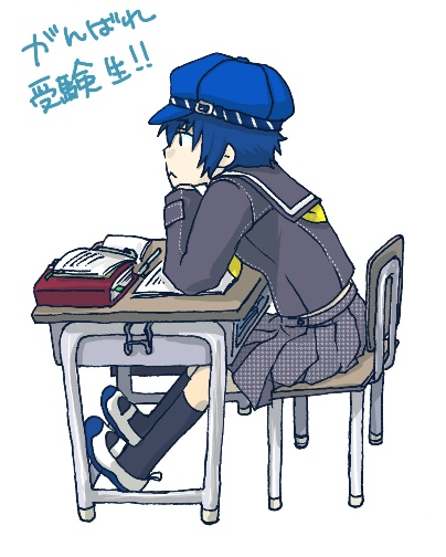 1boy1girlblue hairbookdeskfemale focushatkneehighsnewsboy capschool uniformserafukushort hairskirtsockssolo