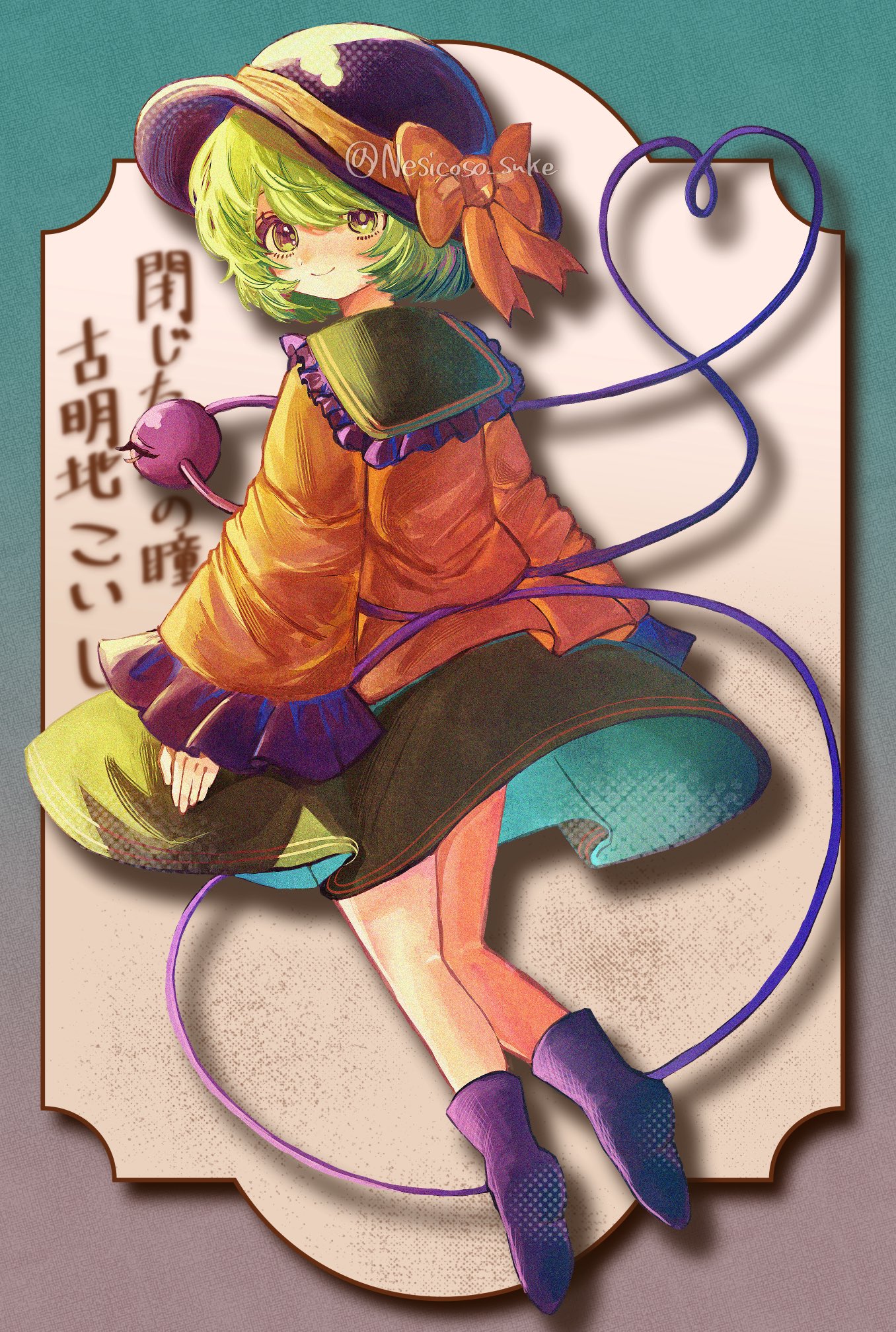 satomura kyou, shiki eiki, touhou, lowres, 1girl, blue eyes, female focus, green hair, hat, looking at viewer, parted lips, smile, solo, upper body