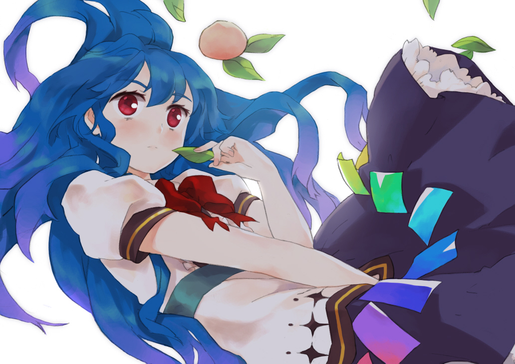 1girlblue hairblushfemale focusfoodfruitleaflong hairno headwearpeachred eyessolowhite background