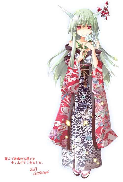 00s1girl2009alternate costumedatedfemale focusflowerfull bodygreen hairhornsjapanese clotheskimonolight smileoff shouldersignaturesimple backgroundsolostandingwhite background