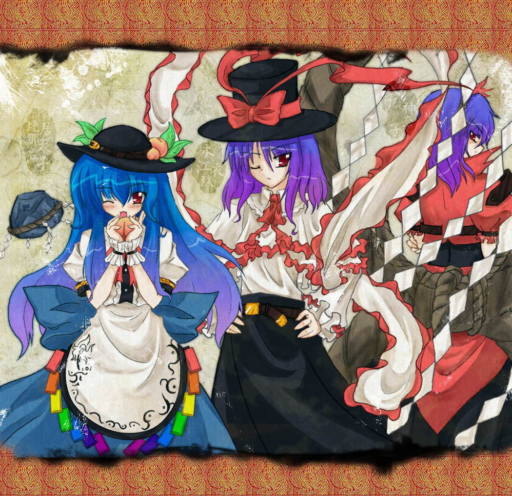pakimoti, kawana tsubasa, maruko gaku, the hundred line -last defense academy-, absurdres, commentary, highres, symbol-only commentary, 1boy, 1girl, black hair, blood, blood on face, blood on hands, bloodshot eyes, blue jacket, closed eyes, ghost, glowing, grey background, halo, hat, hug, jacket, jewelry, kneeling, long hair, necklace, ponytail, print shirt, red eyes, shirt, short hair, smile, tank top, teeth, upper teeth only, white shirt