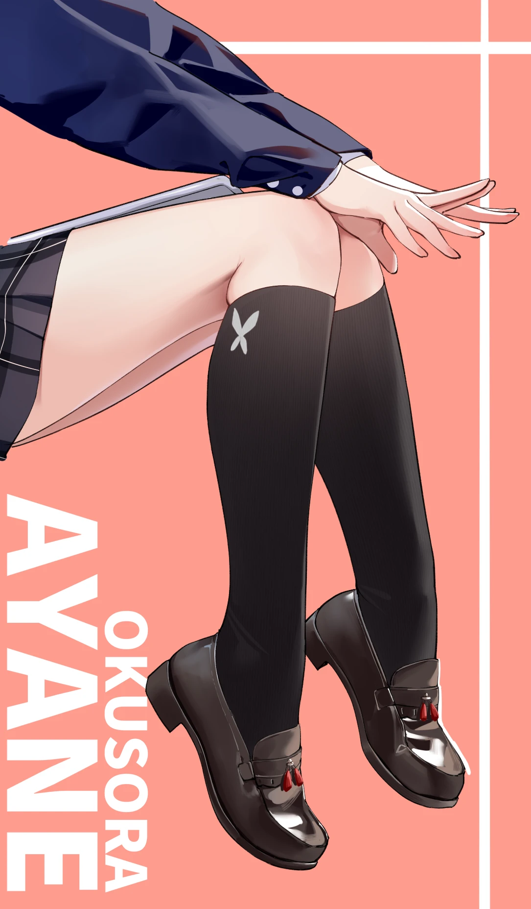 1girlblack socksbrown shoescharacter namefrom sidekneehighsknees together feet apartloaferslong sleevesplaid clothesplaid skirtred backgroundshoessimple backgroundskirtsockssolotassel loafers