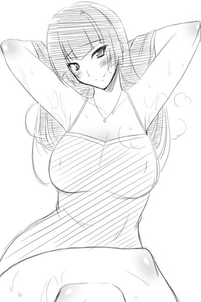 ayakaze ryuushou, ogata rina, white album, white album (series), 1girl, between legs, blush, breasts, brown eyes, brown hair, cleavage, collarbone, dress, female focus, hair ribbon, hand between legs, lingerie, long hair, parted lips, ribbon, sideboob, sitting, solo, strap slip, sundress, two side up, underwear, water, wet, wet clothes