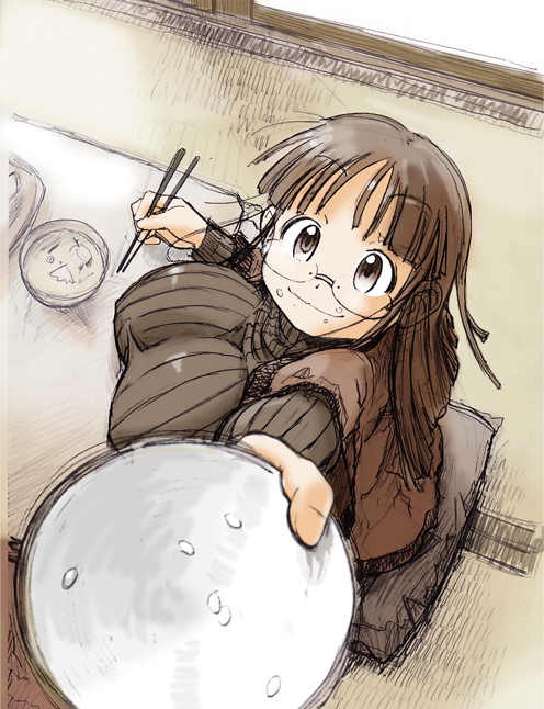 1girlbreastsbrown eyesbrown hairchopsticksdinnerfemale focusfoodfood on facefrom aboveglasseshuge breastshungrylooking upplumpsmilesolosweater