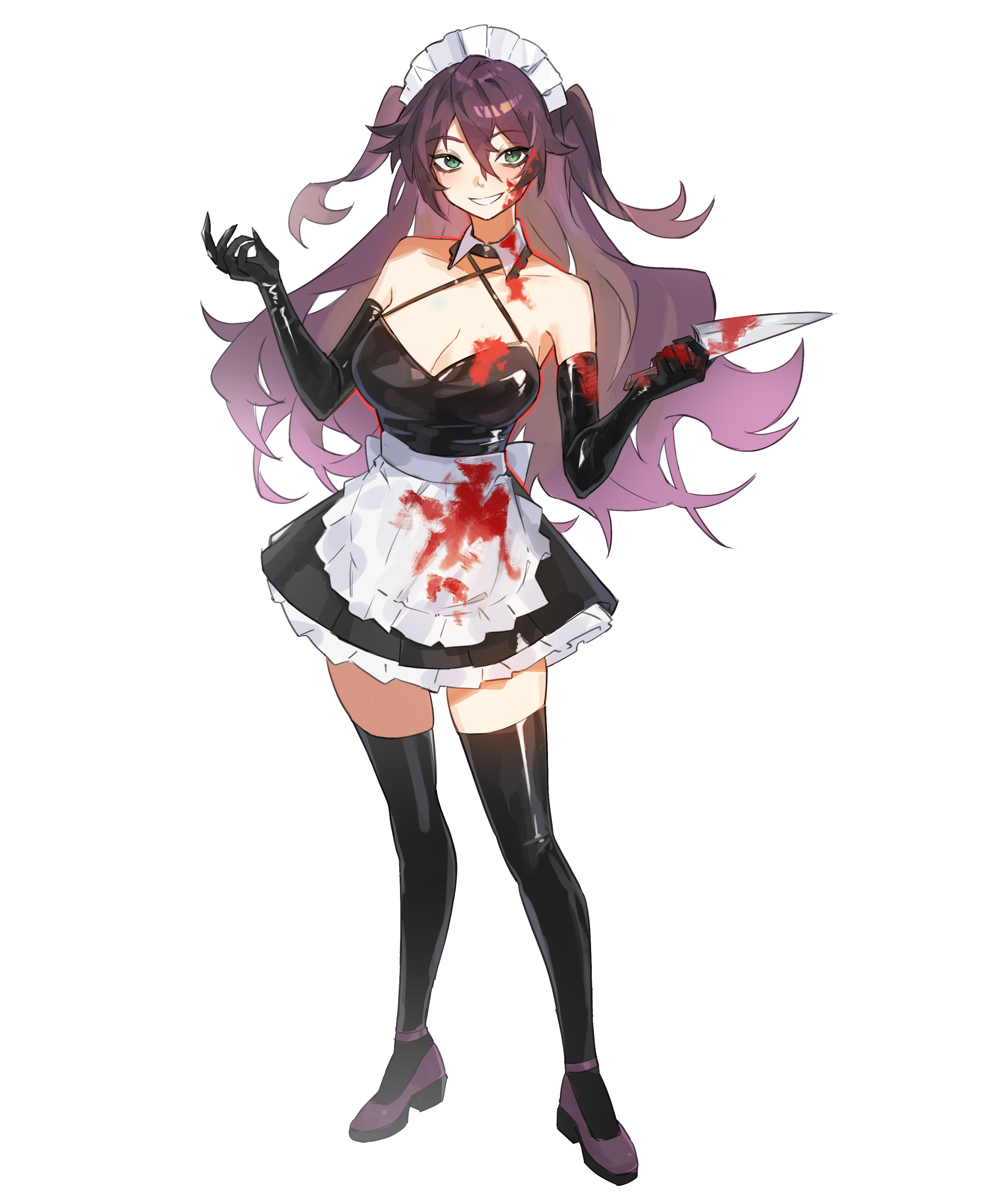 1girlapronbare shouldersblack dressblack glovesblack thighhighsbloodblood on clothesblood on facebloody knifebreastscleavagedouble-parted bangsdresselbow glovesfrilled dressfrillsfull bodyglovesgreen eyeshair between eyesholdingholding knifeknifelarge breastslong hairlooking at viewermaidmaid headdressparted lipsplatform shoespurple hairpurple shoesshoessimple backgroundsmilesolostandingthighhighstwo side upunconventional maidwaist apronwhite apronwhite background
