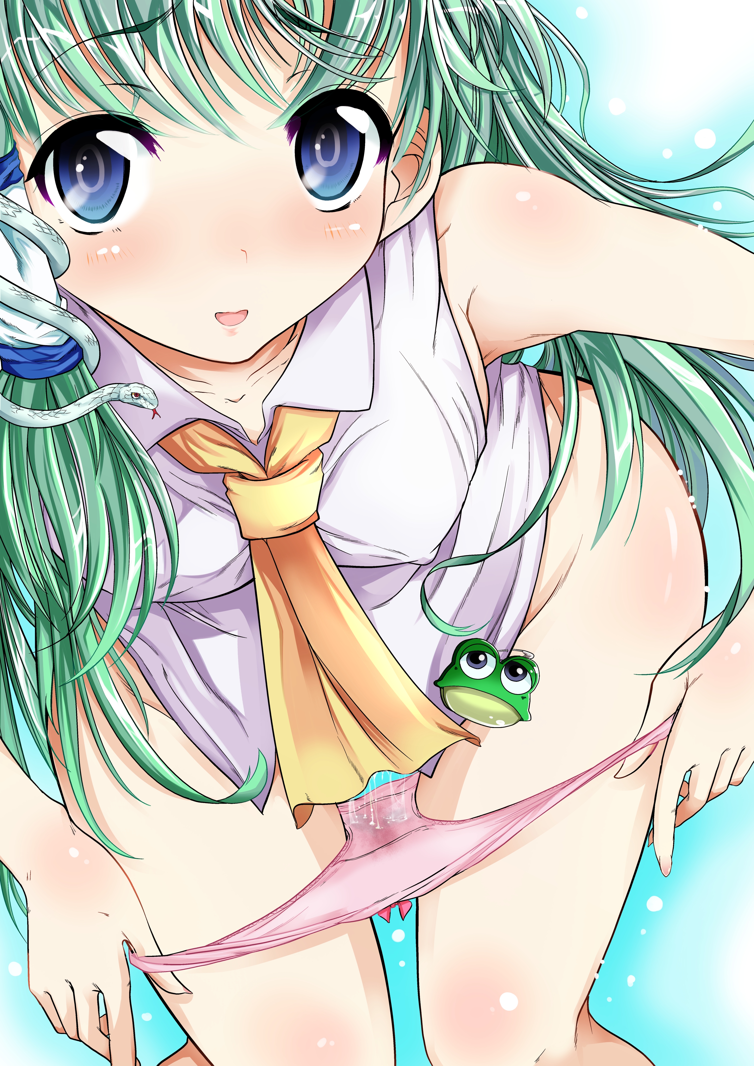 alternate costumeascotbare armsbare legsbare shouldersbent overblue eyesblushbreastserect nipplesfemaleFlag for Deletionfrog hair ornamentgreen hairhair ornamenthair tubesleaning forwardlong hairlooking at viewermound of venusno pantsopen mouthpantiespanty pullpink pantiespussy juicepussy juice drippussy juice stainschool uniformsleevelesssmilesnakesolounderwearwet panties