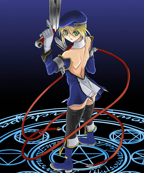 1girlbackberetblonde hairblue bootsbootsdetached sleevesdressfemale focusglovesgreen eyesgunhandgunhathexagrammagic circleoctagrampantiespentagramshort hairsolothighhighstriangleunderwearweaponwhite panties