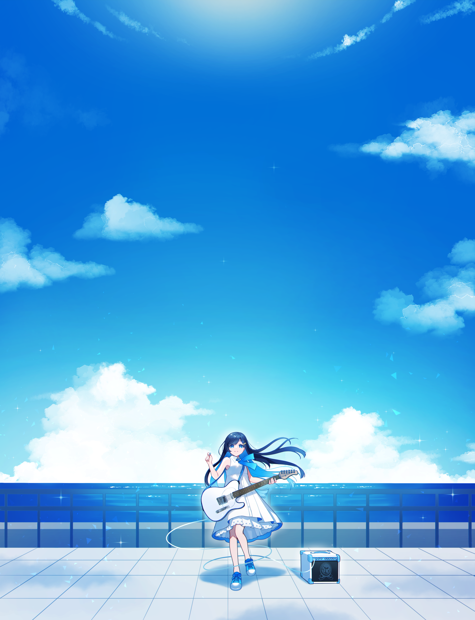 1girlbare armsbare shouldersblue eyesblue hairblue ribbonblue shoesblue skyclosed mouthcloudcollared dresscolored inner hairdaydressguitarhair ornamenthairclipholdingholding guitarholding instrumentinstrumentlong hairmissing commentarymulticolored hairneck ribbonoceanoutdoorsribbonshoesskysleevelesssleeveless dresssmilesolostandingwide shot