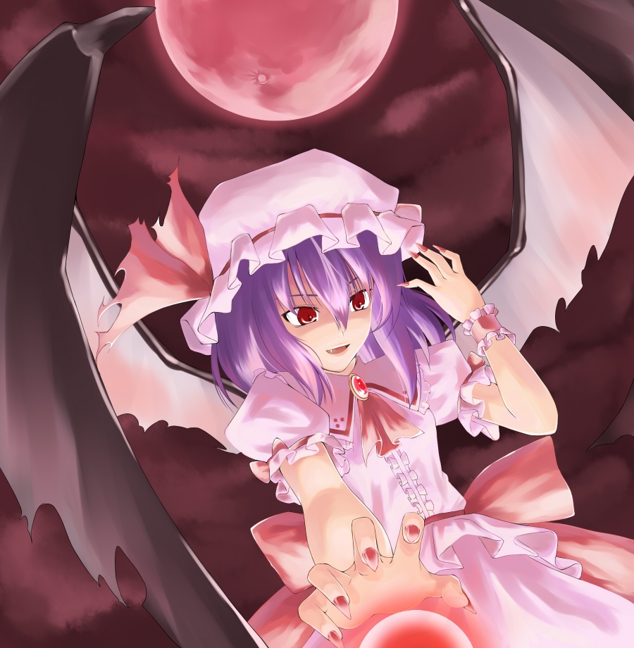 1girlarm garterdemon wingsfemale focusfingernailsgradient backgroundhatmoonnail (hardware)outdoorspurple hairred eyesred moonskirtskysolowings