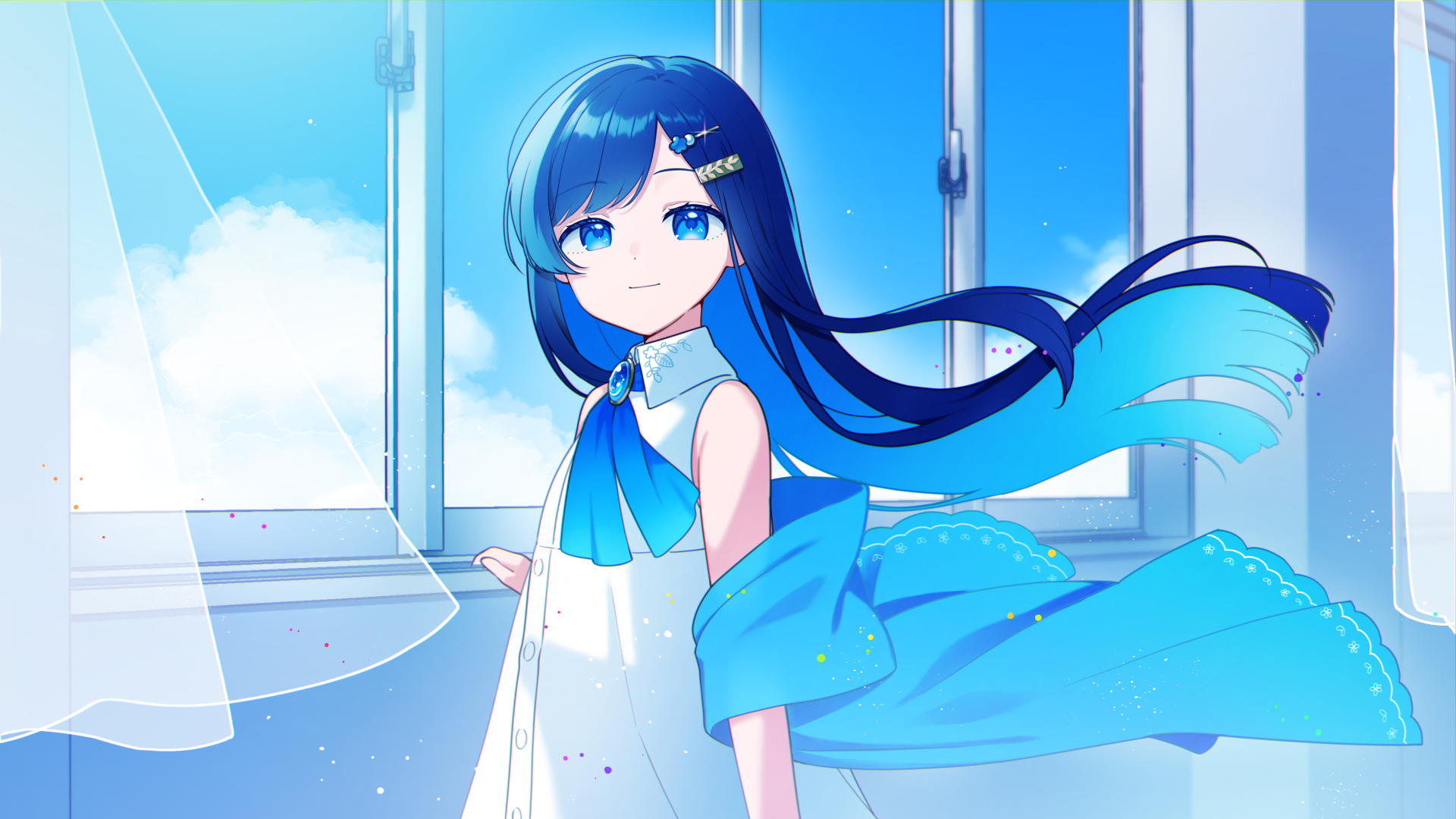 1girlascotbare shouldersblue ascotblue eyesblue hairclosed mouthcollared dresscurtainsdresshair ornamenthaircliplong hairlooking at viewermissing commentarysleevelesssleeveless dresssoloupper bodywhite dresswindow