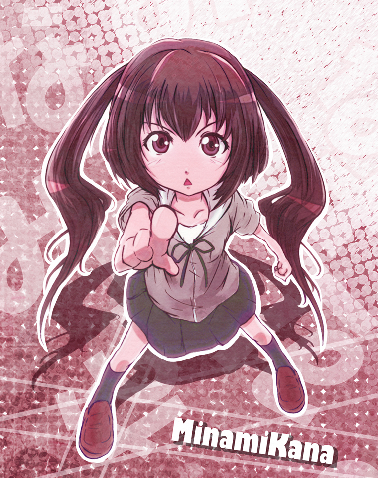 00s1boy1girlbrown eyesbrown hairfemale focusfrom abovelong hairpointingschool uniformsolotriangle mouthtwintails